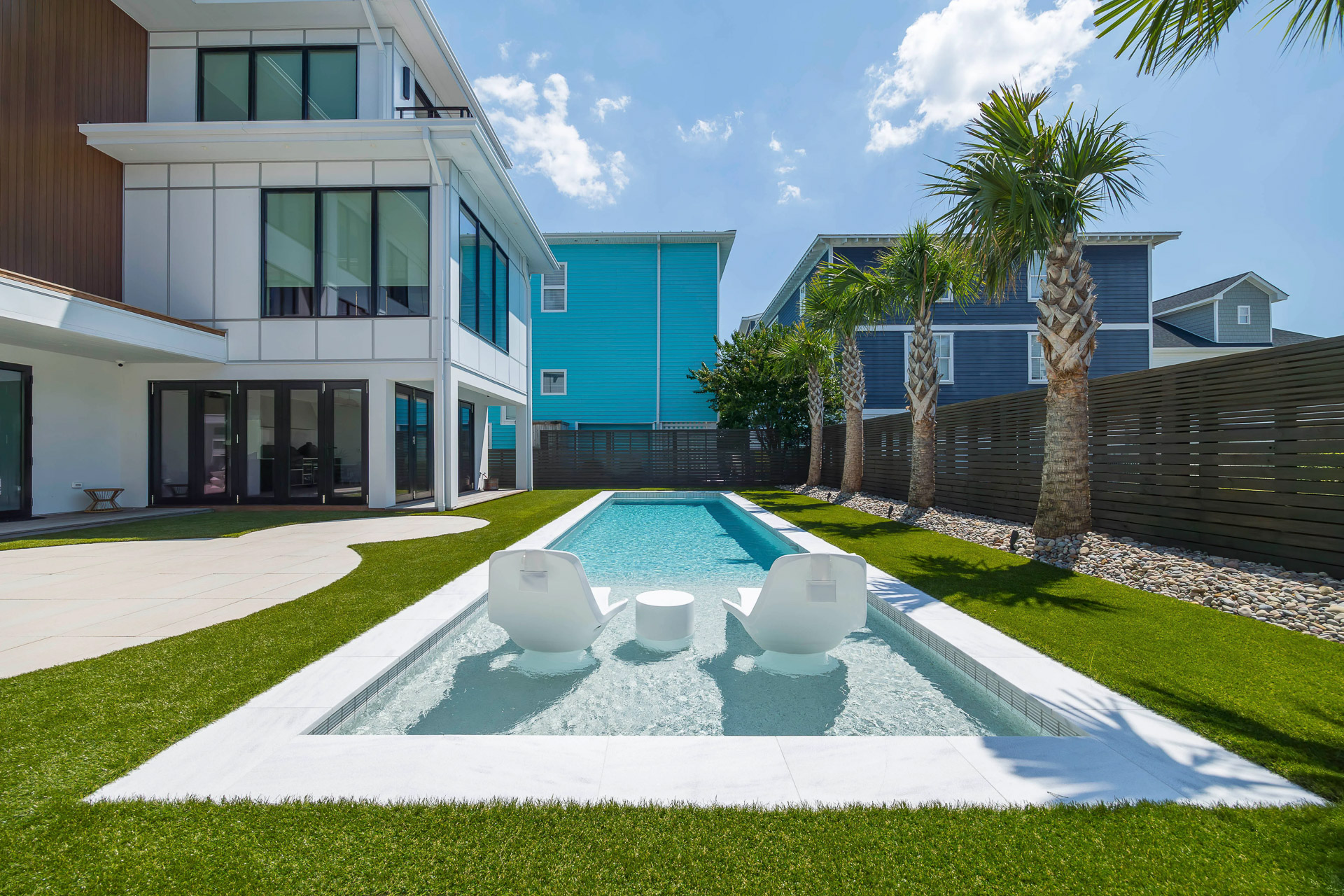The perimeter is wrapped in Akoya Marble Leathered coping, selected by 180spaces for its durability and timeless, natural elegance. Along the waterline, the Hulu White Band (11x11.5) tile also chosen by 180spaces creates a crisp, modern accent that ties seamlessly into the home’s architecture, enhancing the contemporary aesthetic and elevating the pool’s overall design. Surrounding the pool, a lush artificial turf patio delivers a vibrant, low-maintenance outdoor living space, perfectly balancing form and function.